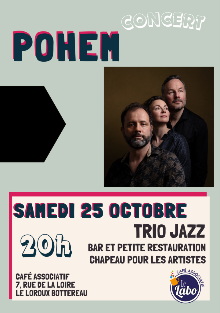 Nous sommes Pohem, un trio de jazz teinté de musiques pop et impressionniste. Voici la présentation réalisée par France Bleu. Nous avons joué récemment au café associatif de Bouaye (L’Equipage) et serions ravis de jouer au Labo.