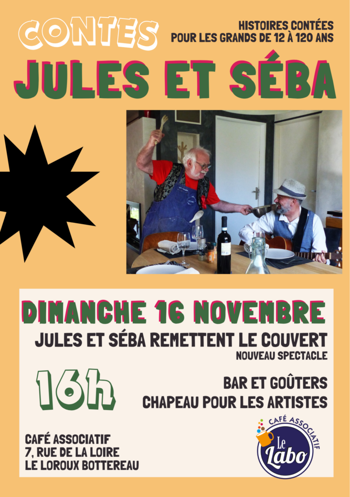 « Depuis 2020 Jules et Séba se mettent en scène pour raconter des histoires. Des cafés de Rouans où ils ont débuté, aux jardins de saint Julien, dans votre salon, les deux compères à chapeau vous embarquent dans un voyage poétique, onirique, sensible à la beauté de la vie et de la mort. Au travers des textes originaux, Jules conte à l’envi des histoires piochées au hasard de la vie, tandis que Séba propose une répartie musicale et s’immisce parfois dans le texte . Le nouveau spectacle « Jules et Séba remettent le couvert » aborde tous les thèmes qui font leur marque de fabrique autour d’une table dressée qui attend ses convives. Il y est question de la beauté des instants, des paradis perdus, de la candeur de vivre.